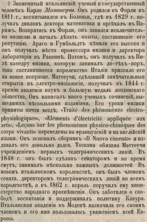 МАТТЕУЧЧИ (Маттеучи) Карло (Matteucci Carlo) (2.06.1811 - 24.06.1868) — итальянский физик и физиолог. Р. в Форли. Окончил Болонский ун-т (1828). Продолжал учебу в Парижском ун-те. До 1840 проводил электрофизиологические исследования дома и в лаборатории в Равенне, в 1840 стал профессором Пизанского ун-та. Занимался также политической деятельностью, был сенатором Великого Герцогства Тосканского (1848-49 — секретарь Сената), сенатором Сардинского королевства (с 1860) и министром народного просвещения (1862). В 1862 реорганизовал Высшую нормальную школу в Пизе в первый итальянский Ин-т перспективных исследований. Член Национальной академии наук Италии (в 1866-68 — президент).
