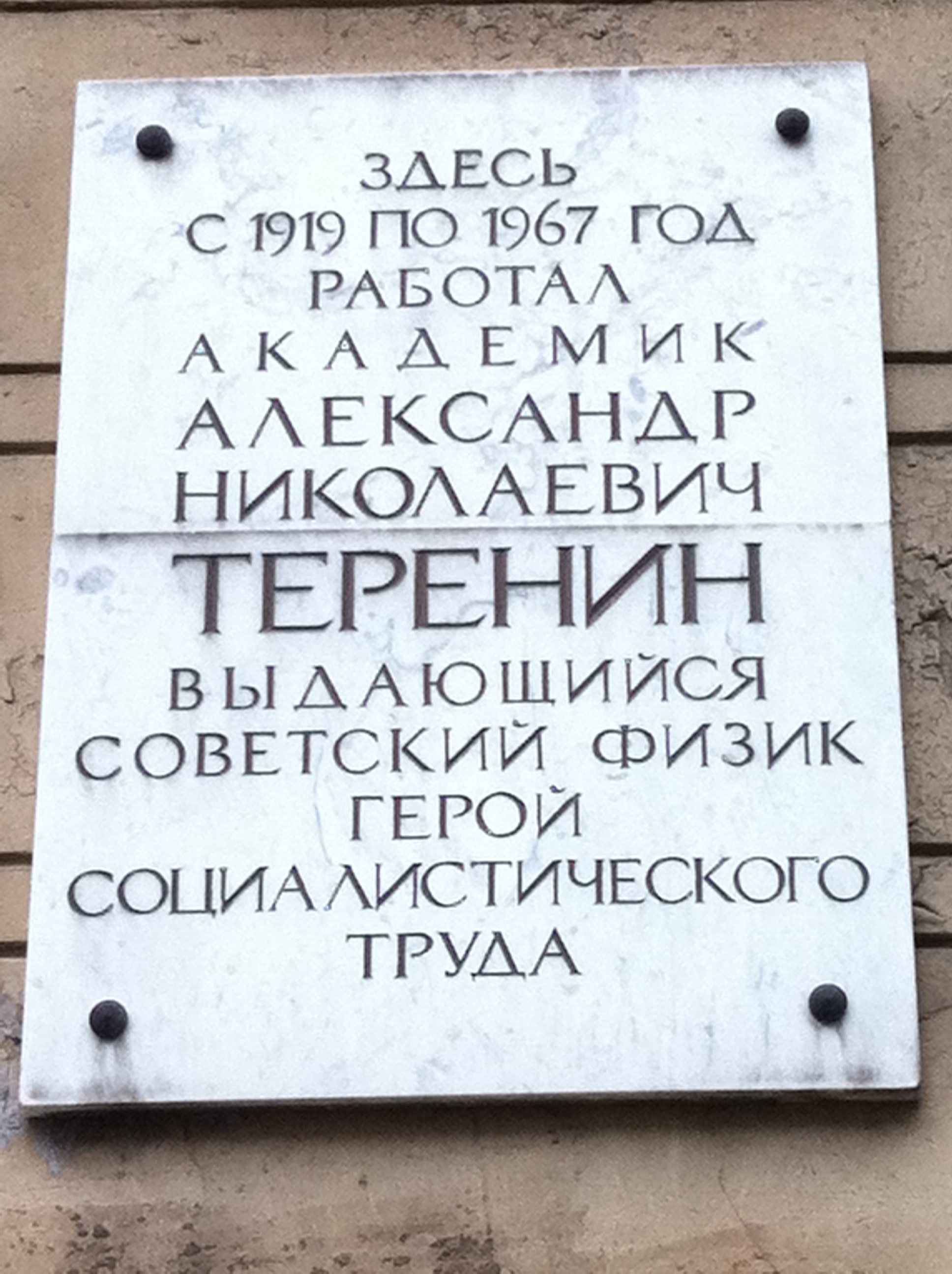ТЕРЕНИН Александр Николаевич (6.V.1896 - 18.I.1967) — советский физико-химик, академик (1939, чл.-кор. 1932). Р. в Калуге. Окончил Петроградский ун-т (1922), где начал работать (с 1932 — профессор). Одновременно работал в Государственном оптическом ин-те (в 1945 - 56 — научный руководитель).
