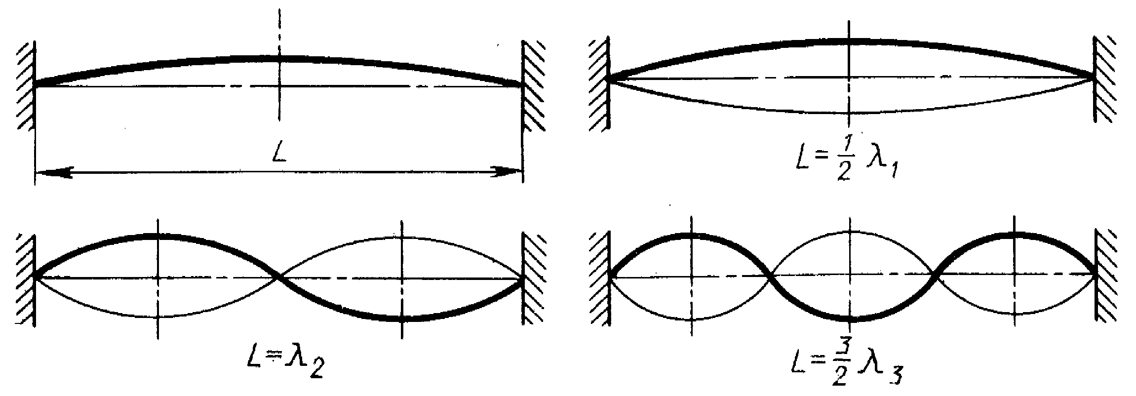 Образование стоячих волн является резонансным явлением, которое происходит на резонансных или собственных частотах тела.Точки, где интерференция гасится, называются узлами, а точки, где интерференция усиливается,— пучностями. Помимо поперечных стоячих волн существуют еще и продольные стоячие волны.