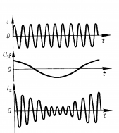 Изменение амплитуды колебаний высокой (несущей) частоты колебаниями низкой (звуковой) частоты называется амплитудной модуляцией. Для получения амплитудно-модулированных электромагнитных колебаний в цепь транзисторного генератора последовательно с колебательным контуром включают катушку трансформатора.
