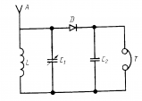 Детекторный радиоприемник состоит из колебательного контура, антенны, детектора (диода), конденсатора постоянной емкости, телефона. В контуре принятая радиоволна возбуждает модулированные колебания. Конденсатор переменной емкости настраивает контур в резонанс с принятой радиоволной. Модулированные колебания ВЧ поступают на детекторный каскад. После прохождения детектора составляющая тока ВЧ идет через конденсатор постоянной емкости, а составляющая тока НЧ идет на обмотки катушек телефона. Так как ,то для тока высокой частоты , а для тока низкой частоты . Таким образом, по катушкам телефона идет ток низкой частоты, вызывающий колебания мембраны с той же звуковой частотой.