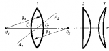 Собирающие (положительные) линзы - это линзы, преобразующие пучок параллельных лучей в сходящийся: двояковыпуклые (1), где 0102 — главная оптическая ось, R1R2— радиусы кривизны поверхности, плоско-выпуклые (2),выпукло-вогнутые (3).