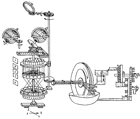 Сохранились сообщения о двух приборах – часах Ктезибия, которые ввиду своих особых достоинств заслуживают хотя бы краткого описания. В часах, приводимых водяным колесом, Ктезибий осуществил идею передачи сил и движения зубчатым механизмом, проект которого еще в IV в. до н.э. теоретически наметил Аристотель, но практически использовал лишь Ктезибий. Зубчатая передача соединяла ведущий механизм со шкалой времени, расположенной на цилиндрической поверхности поворотной колонны и разделенной вертикальными прямыми на четыре основных поля. Система из 24 наклонных линий образовывала, собственно говоря, часовую шкалу для измерения планетных часов. Колонна со шкалой, приводимая водяным колесом, вращаясь вокруг своей оси, совершала один оборот в год. Поэтому и камеры водяного колеса в нижней части часов заполнялись водой медленно, причем вода подавалась в небольшом количестве по особому трубопроводу. Статуэтка со стрелкой двигалась с помощью специального поплавкового механизма, управляемого другой статуэткой, находящейся на другой стороне часов. Слезы – водяные капли, – капающие из глаз статуэтки, накапливались в сборники-подставки, откуда через трубопровод текли в поплавковую камеру стрелочного механизма. Кроме того, эти часы имели еще специальное устройство, которое через определенные интервалы выбрасывало на чашку мелкие камешки (это было звуковой сигнализацией ночных часов).