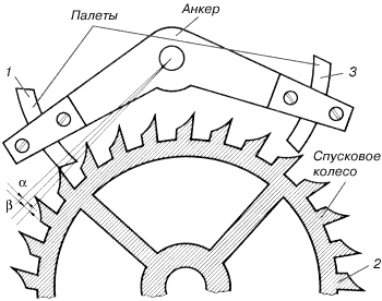Длина этого импульса выражена углом импульса ?. После окончания импульса палета 1 освободит зуб спускового колеса, спусковое колесо скачкообразно повернется, пока соответствующий зуб спускового колеса 2 не натолкнется на поверхность покоя второй палеты 3. Затем маятник легко перейдет на свою точку левого поворота и снова возвратится, пока зуб 2 перейдет с поверхности покоя на наклонную плоскость импульса правой палеты, а анкер получит импульс в обратном направлении. Этот процесс циклически повторяется. Анкерный механизм работает с двусторонним импульсом. Спусковое колесо при каждом полуобороте поворачивается на половину шага зубьев. Короткий скачок спускового колеса, сопровождаемый известным характерным тиканьем часов, правда, связан с некоторой потерей энергии, но он необходим для придания импульса анкеру и осциллятору.