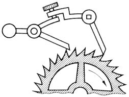 Лучшее решение спускового механизма напрашивалось в виде системы параллельных валов с плоским спусковым колесом, имеющим зубцы на своей торцовой поверхности. Важным шагом было создание группы храповых спусковых механизмов. Самый старый из них – двухрычажный храповой механизм, созданный Шевалье де Бетуном. Такой спусковой механизм, схема которого приведена на рис. 10, изготовлял примерно в 1727 г. для своих часов парижский часовой мастер Антуан Тиоу (1692...1767), автор часто упоминаемого сочинения «Трактат о хронометрии» (Traite d'horlogerie) от 1741 г. На валу правого рычага с винтом для задания взаимного положения палет здесь имеется вилка. Гиря на левом плече другого рычага удерживает внутренние плечи обоих рычагов в постоянном контакте. Двухрычажный спусковой механизм имел много конструктивных вариантов. Некоторые из них были довольно сложны и вносили в механизм нежелательные силы трения.