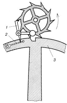 Принцип свободного стопорного спускового механизма для маятниковых осцилляторов весьма стар. Теоретически этот принцип разработал еще Галилей, но осуществлен он был намного позднее. Своим слабым влиянием на точность хода часов он привлек внимание передовых часовых мастеров того времени. Одной из попыток использования этого принципа был спусковой механизм Берту, приведенный на рис. 16. Как и другие стопорные спусковые механизмы, он работал с односторонним импульсом, получаемым при каждом полуколебании. Захват и отпуск спускового колеса осуществляли консоль 1 с грузом и листовая пружина 2, закрепленная на маятнике. Импульс сообщали зубья спускового колеса через импульсную площадку маятника 3. Известно решение и в виде двухколесного спускового механизма Юргенса. У этого спуска зубья большого колеса являются захватными, а зубья внутреннего колеса – импульсными.