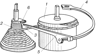 1 – барабан пружины, 2 – завиток, 3 – струна (цепочка), 4 – пружина завитка, 5 – рычаг завитка, 6 – палец завитка
