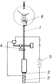 1 – маятник, 2 – ярмо, 3 – импульсная катушка, 4 – контакт Гиппа, 5 – источник, 6 – счетчик колебаний