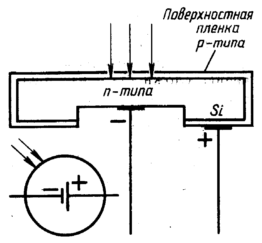 Принцип действия солнечной батареи: при поглощении кванта энергии hv полупроводником освобождается дополнительная пара носителей (электрон и дырка), которые движутся в разных направлениях: дырка — в сторону полупроводников p-типа, а электрон — в сторону полупроводников n-типа.