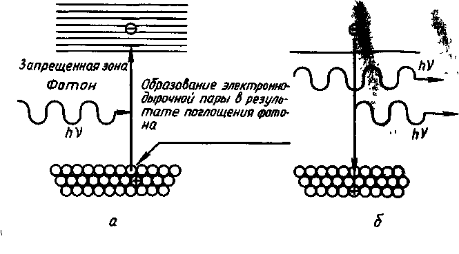 1. Квант света может быть поглощен полупроводником, при этом образуется пара - электрон и дырка, причем разность энергий между электроном и дыркой равна энергии кванта. Этот процесс связан с уменьшением энергии электромагнитного поля и носит название резонансного поглощения. (рис. 3, а).