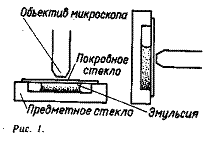 Препарат может быть помещен вертикально, а микроскоп горизонтально; тогда сразу видно распределение эмульсии по высоте. Таким способом я наблюдал эмульсию много раз, но
