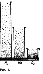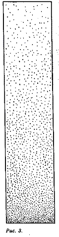 Так или иначе, всегда можно констатировать, что распределение зерен, сначала как будто однородное (что происходит вследствие встряхивания препарата при его установке), перестает быть таковым, что нижние слои делаются все богаче и богаче зернышками, но это обогащение постепенно замедляется, и, наконец, устанавливается стационарный режим, при котором концентрация убывает с высотой. Рисунок 3 составлен из пяти отдельных снимков, снятых на равноотстоящих уровнях эмульсии и сложенных затем соответственным образом. Аналогия рисунков 2 и 3 с рисунком 4, показывающим распределение молекул газа, очевидна...