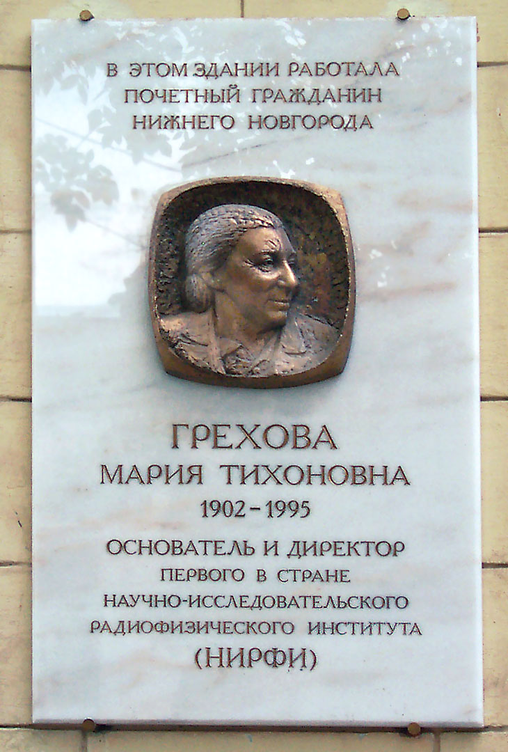 ГРЕХОВА Мария Тихоновна (23.IV.1902 - 19.XI.1995) – советский физик и радиофизик. Р. на станции Новогеоргиевск (близ Варшавы). В 1918 в Москве окончила среднюю школу, в 1924 – физико-математический факультет МГУ, в 1928 году аспирантуру МГУ. Работала во Всесоюзном электротехническом ин-те. В 1932 направлена в Нижний Новгород. В 1932 - 1960 работала в Горьковском государственном университете им. Н.И.Лобачевского (организатор и первый денка радиофизического ф-та). и Горьковском научно-исследовательском физико-техническом институте. Д-р физ.-мат. наук (1936, без защиты диссертации), профессор (1938). Инициатор создания: Научно-исследовательского радиофизического ин-та (1956, директор 1956 - 1972); отдела радиофизических и гидрофизических методов в медицине (ИПФ РАН, 1977, руководитель в 1977 - 1987). В 1973 организовала постоянно действующий семинар "Физика и радиоэлектроника в медицине и экологии". В 1992 по ее инициативе создан филиал кафедры экологии при биологическом факультете ННГУ. Внесла большой вклад в создание радиофизической школы в Нижегородском (Горьковском) ун- те. Жена В.И. Гапонова (1922). Мать С.В. Гапонова и А.В. Гапонова-Грехова. Заслуженный деятель науки и техники РСФСР (06.04.1963).