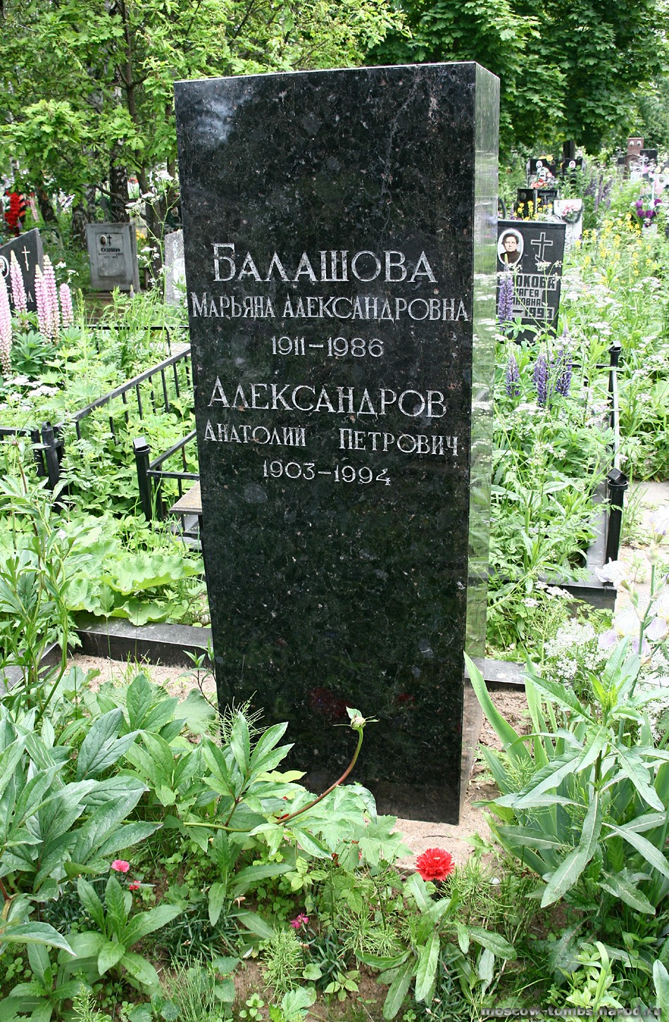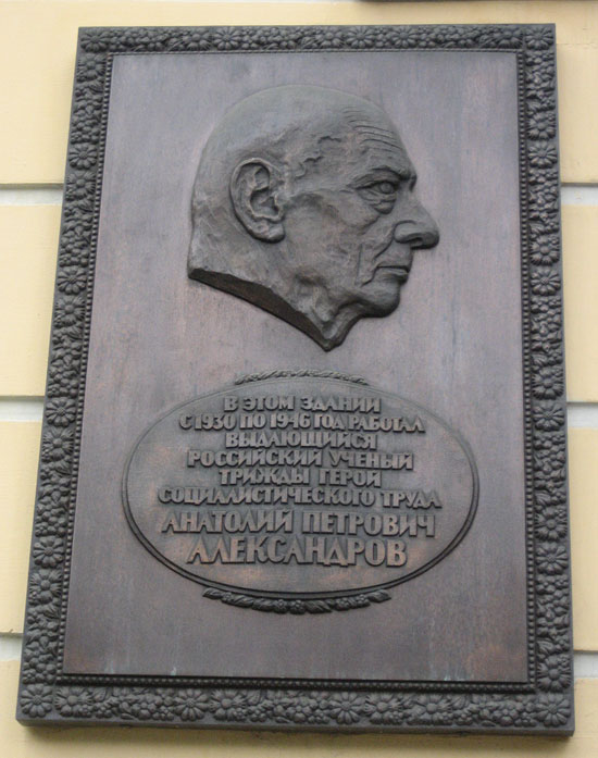 АЛЕКСАНДРОВ Анатолий Петрович (13.11.1903 – 3.02.1994) — советский физик, академик (1953, чл .- кор. 1943), президент АН СССР (с 1975). Р. в г. Тараще (ныне Киевской обл.). Окончил Киевский ун-т (1930) и работал в Ленинградском физико-техническом ин-те АН СССР. Канд. физ.-мат. наук (1937, «"Пробой твердых диэлектриков"»). Д-р физ.-мат. наук (1941, «Релаксация в полимерах»). В 1946-55-директор Института физических проблем АН СССР, с 1960 — Ин-та атомной энергии им И. В. Курчатова. Дядя Е.Б. Александрова.