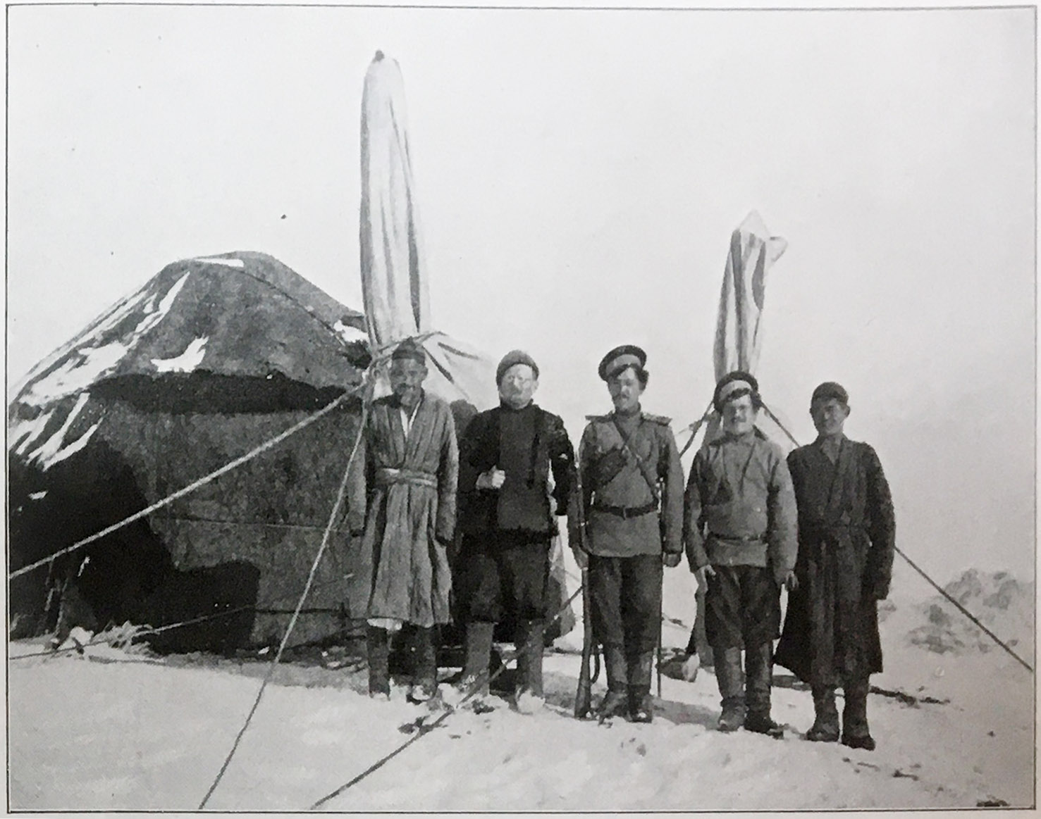 Кроме того, есть еще одна фотография со Станкевичем из отчета по экспедиции. Он стоит с казаками и проводниками.