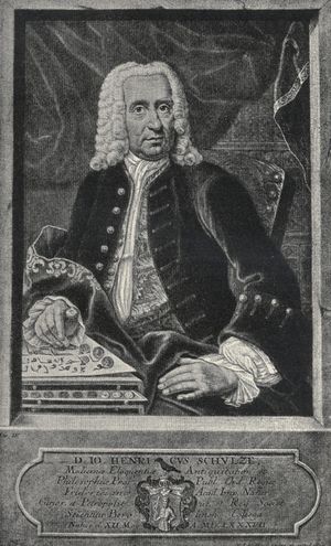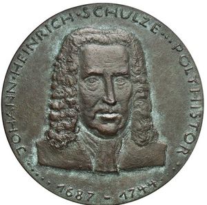 ШУЛЬЦЕ Иоганн Генрих (Schulze Johann Heinrich) (12.05.1687-10.10.1744) – немецкий ученый. Р. В Кольбице, герцогство Магдебург, королевство Пруссия. Осиротел в раннем возрасте. Учился в 1697-1704 в приюте Августа Германа Франке. В 1704-17 изучал медицину, химию, философию и теологию в университете Галле. В 1720-32 был профессором в Альтдорфском университете, а затем до 1744 года в университете Галле, где занимал должность профессора древностей. Член академии Леопольдина. Иностранный (почетный) член Петербургской АН (1738).