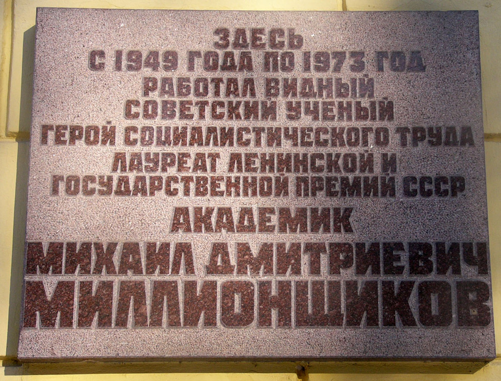 МИЛЛИОНЩИКОВ Михаил Дмитриевич (16.I.1913 - 27.V.1973) - советский физик и общественный деятель, академик (1962; чл.-кор. 1953), вице-президент АН СССР с 1962. Р. в Грозном. Окончил Грозненский нефтяной ин-т (1932). По окончании в 1938 аспирантуры Московского авиационного ин-та работал там же. В 1944 - 49 — в Ин-те механики АН СССР, с 1949 - зав. отделом и с 1960 — заместитель директора Ин-та атомной энергии им. И. В. Курчатова. Профессор Московского инженерно-физического ин-та (с 1949).
