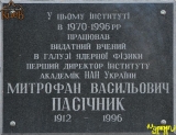 ПАСЕЧНИК Митрофан Васильевич (ПАСІЧНИК Митрофан Васильович) (17.VI.1912 - 8.ХІ.1996) – советский и украинский физик, акад. АН УССР (1961). Р. в Жирковке (ныне Полтавская обл.). Окончил Полтавский ин-т социального воспитания (1931). В 1932-40 и 1946-70 работал в Ин-те физики АН УССР (в 1949 - 65 – директор). С 1970 работает в Ин-те ядерных исследований АН УССР (в 1970-73-директор). В 1947-60 – также зав. кафедрой Киевского ун-та. Участник Великой отечественной войны с первого до последнего дня.